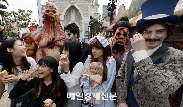 25일 서울 송파구 롯데월드 어드벤처에서 호러 공연 ‘스트리트 호러 쇼: 더 마리오네트’ 배역들이 관람객들과 기념촬영을 하고 있다. 롯데월드 어드벤처는 9월 6일부터 11월 16일까지 72일간 실내 공간인 어드벤처와 야외 매직아일랜드의 콘텐츠를 각각 구분해 ‘큐티 호러’와 ‘리얼 호러’가 공존하는 독창적이면서도 풍성한 즐길거리를 마련했다. 2025.09.25.[김호영기자]