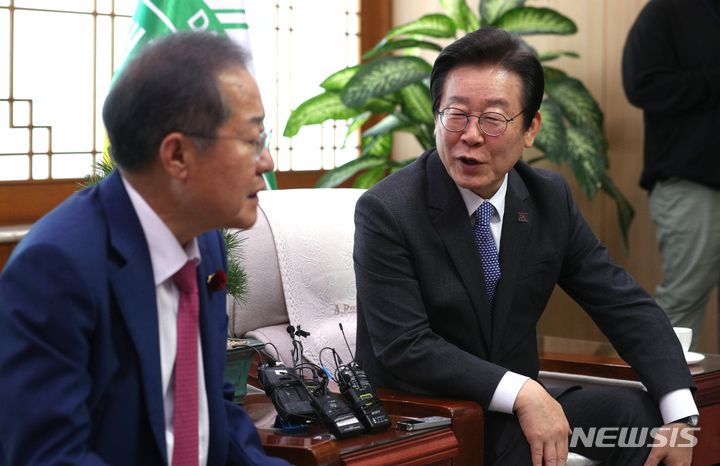 [대구=뉴시스] 이무열 기자 = 이재명 더불어민주당 대표가 10일 오후 대구시청 산격청사를 찾아 홍준표 대구시장과 면담하고 있다. 2023.05.10. lmy@newsis.com