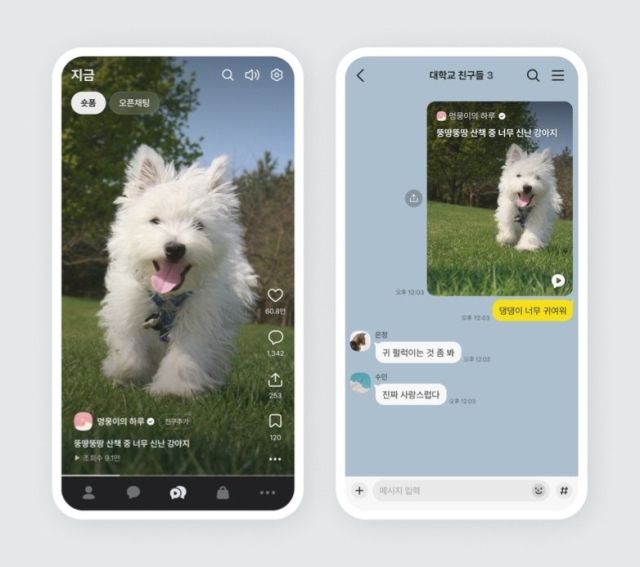 세 번째 탭은 기존 오픈채팅탭에서 ‘지금탭’으로 바뀌어 숏폼 영상 기능이 탑재됐다. 해당 탭에 들어가면 숏폼 영상이 자동 재생된다. 현재 카카오가 제휴를 맺은 다수의 크리에이터 및 MCN의 숏폼 영상이 온보딩돼 있으며, 광고 영상 또한 노출되는 것으로 확인됐다.