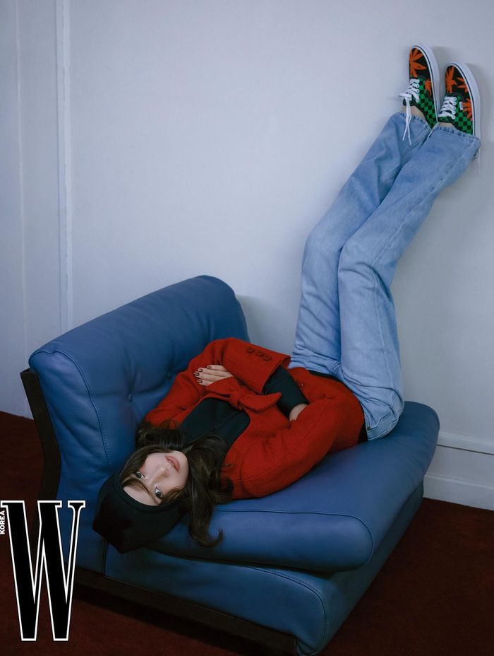 강렬한 레드 코트와 청바지, 그리고 독특한 패턴의 스니커즈를 매치한 컷에서는 소파에 거꾸로 누워 카메라를 응시하는 포즈로 틀에 갇히지 않는 힙하고 장난기 가득한 매력을 발산했다.