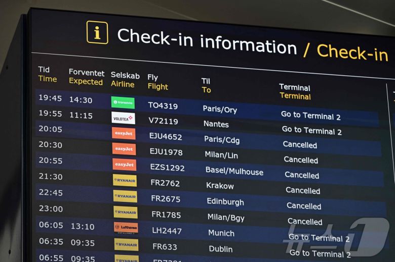 덴마크 코펜하겐공항에 드론 출몰로 인한 항공편 취소 안내가 떠 있다. 2025.09.23 ⓒ AFP=뉴스1 ⓒ News1 이지예 객원기자 |