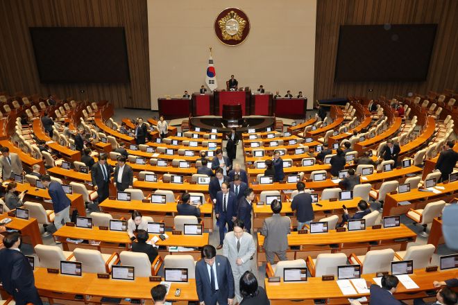 국민의힘 무제한 토론 시작, 퇴장하는 민주당 - 박수민 국민의힘 의원이 25일 서울 여의도 국회 본회의에서 정부조직법 일부개정법률안에 대한 무제한 토론을 시작하자 더불어민주당 의원들이 퇴장하고 있다. 2025.9.25 연합뉴스 |