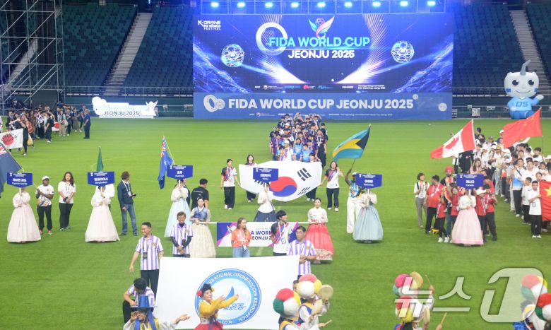 2025 전주드론축구월드컵 개막식이 열린 25일 전북 전주시 월드컵경기장에서 선수단이 입장하고 있다. 2025.9.25/뉴스1 ⓒ News1 유경석 기자 |