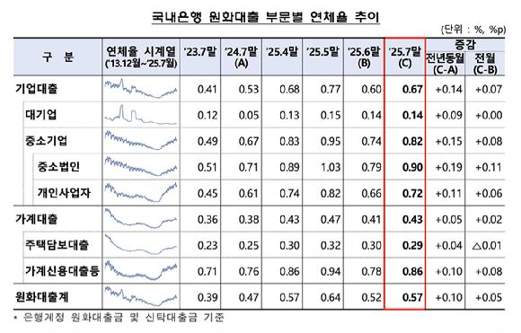 26일 금융감독원의 '원화 대출 연체율 현황(잠정)'에 따르면 7월 국내 은행의 원화 대출 연체율은 0.57%로 전월 대비 0.05%p 증가했다. 전년 동기 대비로는 0.10%p 상승했다.