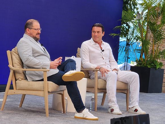 25일 오전(현지시간) 하와이 마우이 하얏트 리젠시 마우이 리조트&스파에서 열린 '스냅드래곤 서밋 2025' CEO 간 대화 섹션에서 크리스티아노 아몬 퀄컴 최고경영자(CEO, 왼쪽)와 타렉 아민 휴메인 CEO가 대화를 나누고 있다. [사진=공동취재단] |