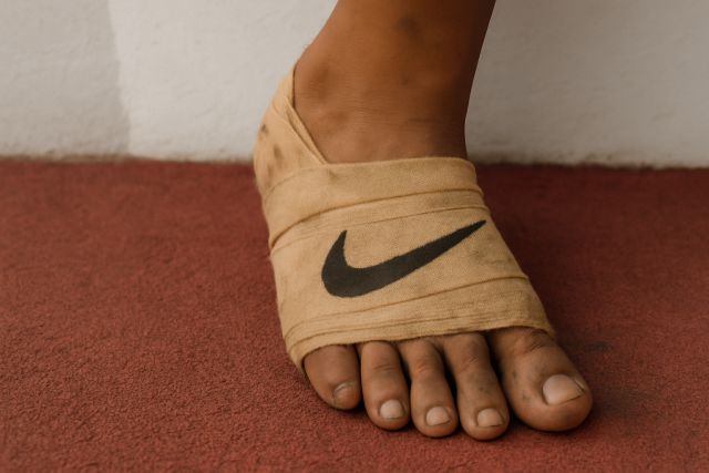불로스는 운동화가 없어 발목과 발가락, 발등에 붕대를 감아 만든 ‘수제 신발’을 신고 경기에 나섰다. 발등에는 직접 그린 나이키 '스우시 로고'를, 발목에는 ‘NIKE’라는 글자를 적어 넣었다.