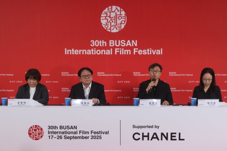 부산국제영화제 정한석 집행위원장(왼쪽 세번째)이 26일 오전 부산 영화의전당에서 열린 ‘제30회 부산국제영화제 결산 기자회견’에서 인사말을 전하고 있다. 연합뉴스 제공 |