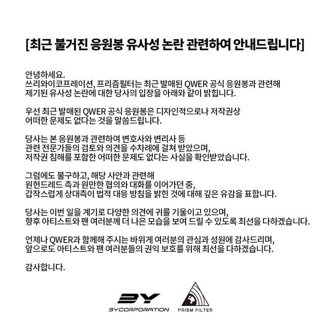 안녕하세요. 쓰리와이코프레이션, 프리즘필터는 최근 발매된 QWER 공식 응원봉과 관련해 제기된 유사성 논란에 대한 당사의 입장을 아래와 같이 밝힙니다.