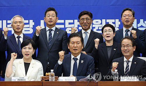 시·도당위원장 연석회의서 기념촬영하는 정청래 대표(서울=연합뉴스) 박동주 기자 = 더불어민주당 정청래 대표가 26일 서울 여의도 국회에서 열린 시·도당위원장 연석회의에서 기념촬영을 하고 있다. 2025.9.26 pdj6635@yna.co.kr