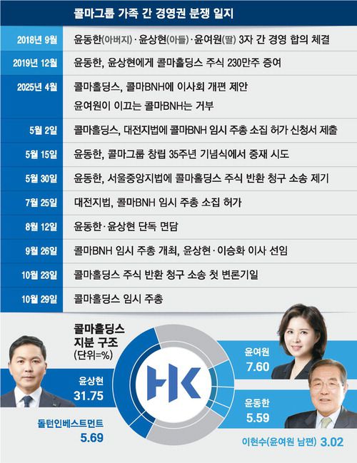 콜마홀딩스 자회사인 콜마비앤에이치(콜마BNH)의 경영권을 둘러싸고 벌어진 가족 간 법적 공방에서 장남인 윤상현 콜마홀딩스 부회장이 승기를 잡았다. 26일 콜마홀딩스는 콜마BNH 임시 주주총회에서 윤 부회장과 윤 부회장의 측근인 이승화 전 CJ제일제당 부사장을 콜마BNH 사내이사로 선임하는 안건이 통과됐다고 밝혔다.