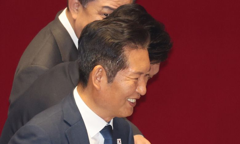 정청래 더불어민주당 대표가 26일 국회 본회의장에서 정부조직법 개정안에 대한 필리버스터(무제한토론) 종결 동의 표결에 투표한 뒤 미소 짓고 있다. 연합뉴스