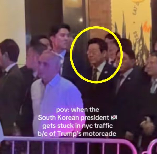 26일 사회관계망서비스(SNS)와 온라인을 중심으로 “트럼프의 의전 차량 행렬 때문에 한국 대통령이 뉴욕 도로에 발이 묶였다”는 설명과 함께 이 대통령이 경호원과 수행원에 둘러싸인 채 멈춰 선 모습의 영상이 퍼졌다.