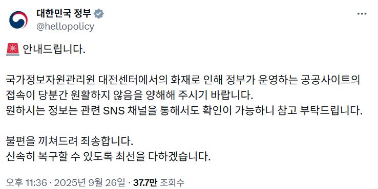 장부 공식 계정인 "대한민국 정부(@hellopolicy)"는 26일 밤 X(옛 트위터)를 통해 "국가정보자원관리원 대전센터에서의 화재로 인해 정부가 운영하는 공공사이트 접속이 당분간 원활하지 않다"고 공지했다.