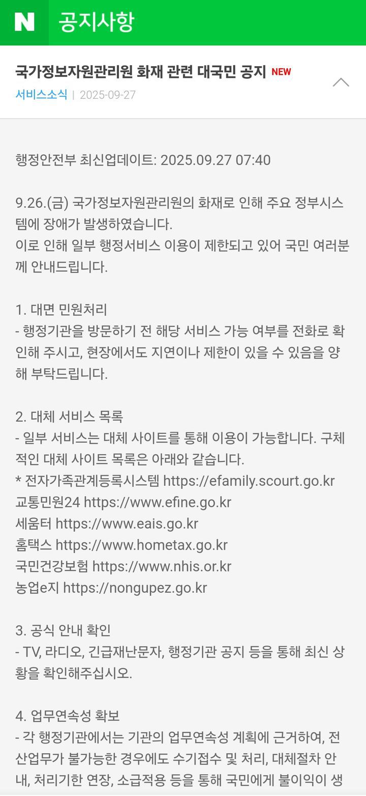 이날 오전 네이버 웹 및 모바일 공지사항, 다음 고객센터를 접속하면 '국가정보관리원 화재 관련 대국민 공지' 글이 노출된다. 해당 공지에는 ▲대면 민원 처리 ▲대체 서비스 목록 ▲공식 안내 확인 방법 ▲업무연속성 확보 등이 기재돼 있다.