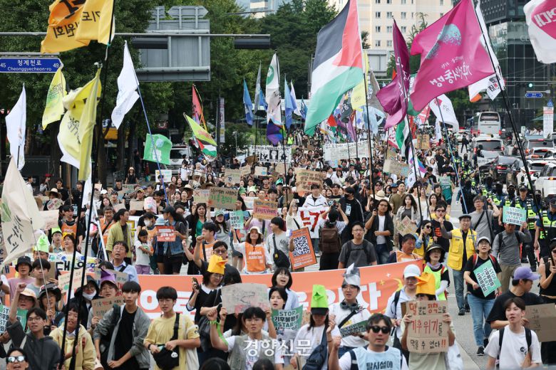 ‘9.27 기후정의행진’ 참가자들이 27일 온실가스 감축 등을 요구하며 서울 종로구 광화문 동십자각에서 종각역과 시청광장 등을 거쳐 돌아오는 행진을 하고 있다. 한수빈 기자