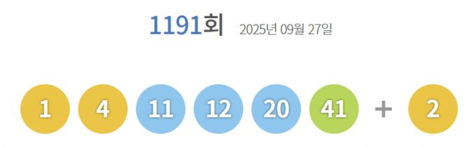 1191회 로또 당첨번호 '1·4·11·12·20·41'…보너스 '2'