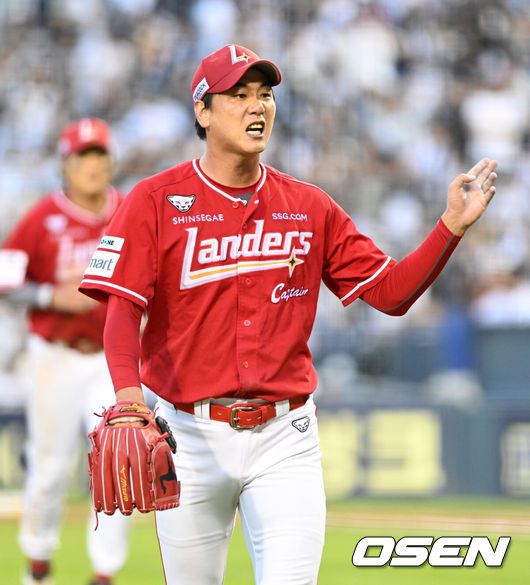[OSEN=잠실, 이대선 기자] 27일 오후 서울 잠실야구장에서 2025 신한 SOL Bank KBO리그 두산 베어스와 SSG 랜더스의 경기가 열렸다.두산은 최승용, SSG은 김광현을 선발 투수로 내세웠다.4회말 수비를 마친 SSG 김광현이 포수 조형우와 이야기를 나누고 있다.  2025.09.27 /sunday@osen.co.kr