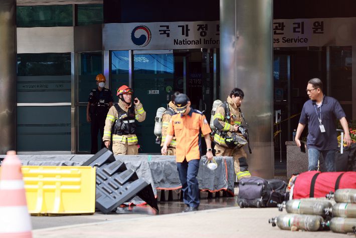 27일 대전 유성구 국가정보자원관리원(국정자원)에서 소방대원이 오가고 있다. 연합뉴스 |