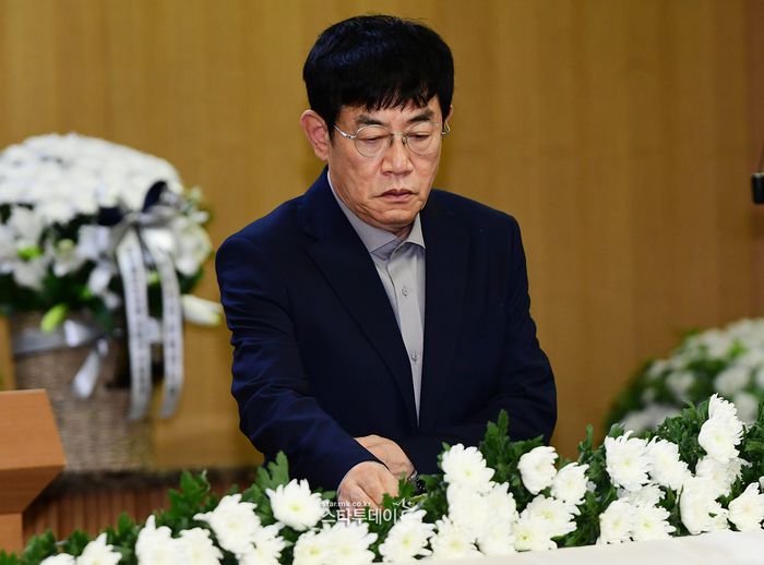 고 전유성 영결식, 코미디언 이경규가 고인을 추모하고 있다. <강영국 기자> |