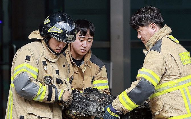 27일 대전 유성구 국가정보자원관리원(국정자원)에서 소방대원이 불에 탄 배터리를 옮기고 있다. (사진=연합뉴스) |