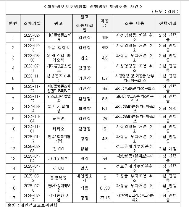개보위가 진행 중인 불복 행정소송은 총 17건으로, 과징금 규모만 1,400억 원을 넘어선다. 특히 원고 측 소송대리인은 김앤장, 광장, 태평양, 세종 등 국내 최고 대형 로펌이 대부분을 차지해, 전력 불균형은 불가피하다.