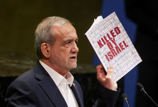 마수드 페제시키안 이란 대통령이 지난 24일(현지시간) 미국 뉴욕 유엔 본부에서 열린 제80차 유엔총회(UNGA)에서 연설하면서 책을 들어보이고 있다.(사진=로이터) |