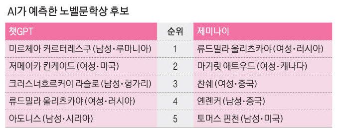 28일 올해 노벨문학상 수상 가능성이 높은 작가를 생성형 인공지능(AI)을 학습시켜 예측한 결과, 챗GPT는 루마니아 작가 미르체아 커르터레스쿠를, 구글 제미나이는 러시아 작가 류드밀라 울리츠카야를 각각 1순위로 꼽았다. 이 순위는 안데르스 올손 노벨문학상 심사위원장을 비롯한 5인의 종신 심사위원의 성향과 사용 언어, 2000년 이후 노벨문학상의 지역·국가 안배, 최근 2~3년간 작가별 수상 모멘텀(굵직한 문학상 수상 등) 등을 종합한 내용으로 이뤄졌다.