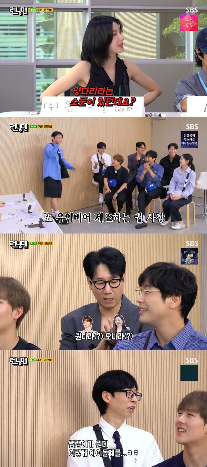 이날 방송에서 권은비는 양세찬이 앞에 나오자마자 “서 있는데 웃기다”며 폭소했다. 그는 “지금 사귀고 있는 여자친구랑 몇 년 정도 됐죠? 양다리라는 소문이 있던데요?”라고 유언비어를 퍼뜨렸다. 지석진은 “권나라, 오나라”라며 특정 연예인을 언급했고 하하도 “쇼츠에서 돌던데요?”라고 물었다.