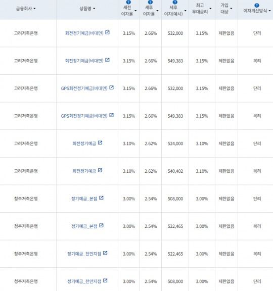 28일 금융감독원 금융상품통합비교공시에 따르면, 저축은행 24개월 정기예금 가운데 기본 금리가 가장 높은 상품은 연 3.15% 금리를 제공하는 고려저축은행의 '회전정기예금(비대면)', 'GPS 회전정기예금(비대면)', 회전정기예금이다.