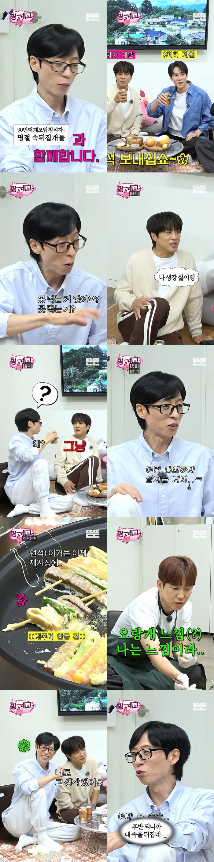 이날 네 사람은 명절 분위기를 자아내기 위해 꼬치전도 함께 만들었다. 유재석이 만든 요리를 본 이들은 웃음을 터뜨렸고, 유재석은 "내 건 제사상에 못 올리지"라며 자조했다. 이에 남창희는 "오랑캐들이 먹을 거 같은 느낌"이라고 표현해 유재석의 속을 또 한 번 뒤집어놨다. 유재석은 "이게 또 슬슬 후반 되니까 내 속을 뒤집네"라며 웃었다.