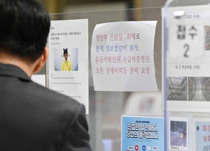 [수원=뉴시스] 김종택 기자 = 국가정보자원관리원(국정자원) 전산실 화재로 온라인 복지 서비스, 정부24 등 주요 업무시스템이 중단된 29일 경기 수원시 승화원에 관련 안내문이 붙어 있다. 2025.09.29. jtk@newsis.com /사진=김종택 |