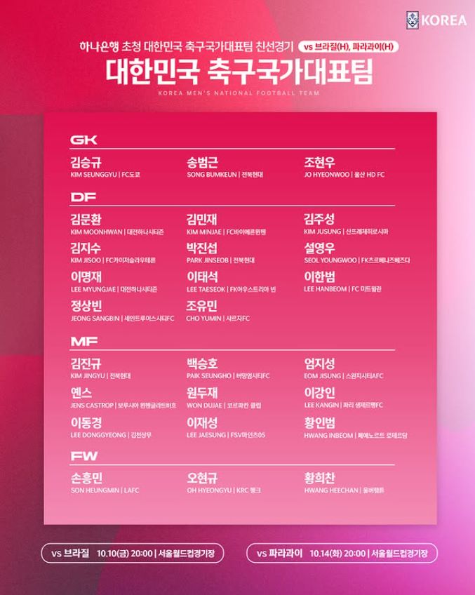 FW: 오현규(KRC 헹크·벨기에), 손흥민(LAFC·미국), 황희찬(울버햄프턴·잉글랜드)