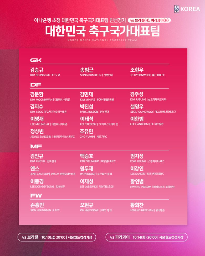 한국은 지난 6월 아시아 3차 예선을 무패로 통과하며 2026 북중미 월드컵 본선 진출을 확정했다. 이후 월드컵을 대비해 다양한 전술 실험과 선수 점검에 돌입했다. 이번 10월 A매치는 월드컵 우승 후보 브라질, 남미 강호 파라과이를 상대로 자신들의 전력을 시험할 소중한 기회다.