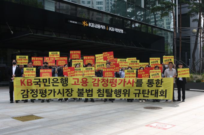 29일 한국감정평가사협회는 KB국민은행 신관 앞에서 국민은행의 감정평가시장 '불법 침탈' 규탄대회를 개최했다고 밝혔다. 협회는 국민은행이 감정평가사를 직접 고용해 가치평가부를 운영하고 있으며, 이를 통해 고액부동산을 자체 평가해 담보대출을 취급하고 있다고 비판했다.