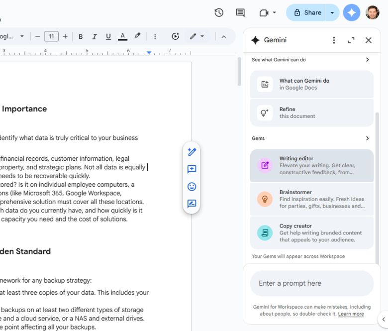예를 들어, 구글 문서에서 문서를 열어 둔 상태로 글쓰기 편집기 젬을 선택하면 패널에 4가지 사전 작성된 프롬프트가 나타난다. 이 가운데 하나를 클릭하면 제미나이가 문서에 대해 설명된 작업을 실행한다. “이 문서의 변경 사항을 추천해줘”, “더 격식 있는 표현을 알려줘”와 같은 식이다.