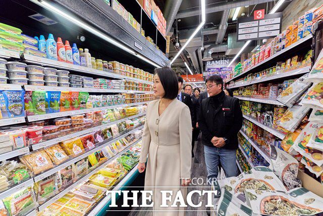 영부인 김혜경 여사는 29일 저녁 갑작스런 어지럼증을 호소해 검진을 받았고, 그 결과에 따라 이석증 치료를 받았다. 이재명 대통령 방미 일정에 동행한 김 여사가 23일(현지시간) 미국 뉴욕 코리아타운을 찾아 식료품을 둘러보고 있다. /대통령실