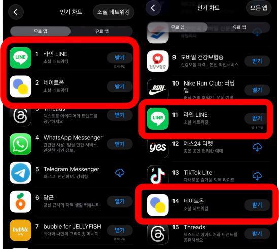 30일  애플 앱스토어 '소셜 네트워킹'을 카테고리에서 현재 라인과 네이트온이 각각 1위와 2위에 올랐다. 전체 앱 순위에서도 라인은 11위, 네이트온은 14위에 올라 있다.  애플 앱스토어