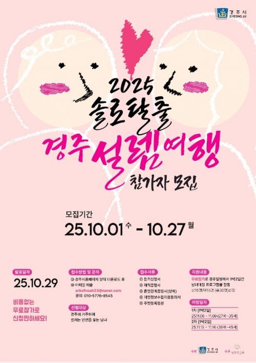 모집을 거쳐 오는 11월 연령대별로 2개 기수(1기:27~35세, 2기:36~45세)를 편성해 커플 매칭 여행을 진행할 계획이다. 최종 참가자는 10월 29일 개별 통보할 예정이며, 모집 공고와 신청서류는 경주시 홈페이지에서 확인할 수 있다.