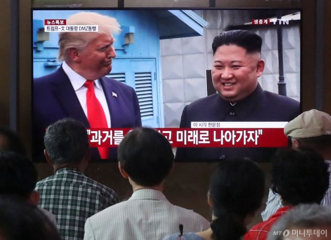 30일 오후 서울역 대합실에서 시민들이 판문점에서 도널드 트럼프 미국 대통령과 김정은 북한 국무위원장이 만나는 모습을 보고 있다.