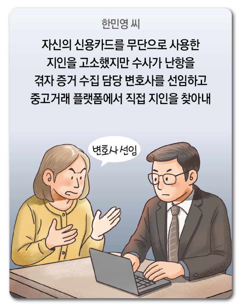 지난해 지인에게 신용카드 도용 사기를 당한 한민영(가명) 씨는 억울한 마음에 경찰에 고소장을 냈다. 하지만 가해자가 전화번호를 바꾸고 잠적하면서 수사가 제대로 진행되지 않았다. 결국 한 씨는 증거 수집만 전문으로 담당하는 변호사를 선임했다. 가해자가 이용했던 와이파이 접속 기록을 분석하는 등 직접 찾아 나선 끝에 강원도 일대에서 와이파이에 접속했던 정황을 포착했다. 결국 한 씨는 “중고 거래 플랫폼에서 대면 거래하자”며 가해자를 강원도의 한 빌라촌으로 불러냈고, 한 씨의 제보를 받은 경찰은 가해자를 긴급 체포했다.
