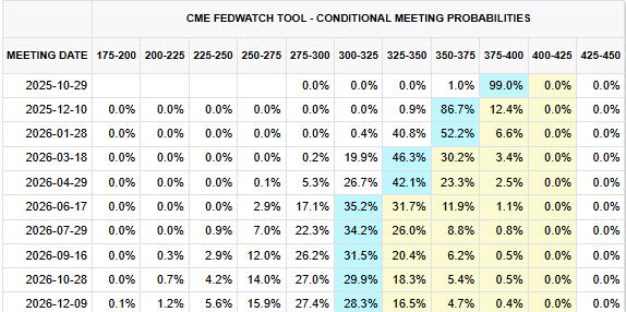 시장조사업체 시카고상품거래소(CME) 그룹의 ‘페드워치’에 따르면 장 마감시점 시장은 10월 연방공개시장위원회(FOMC) 회의에서 금리 인하가 단행될 가능성을 99%로, 12월 회의에서 추가 인하 가능성을 86.7%로 반영하고 있다. 이는 셧다운이 시작된 직후보다 높은 수치다. 10월엔 ‘빅컷’ 가능성도 1%를 반영했다.
