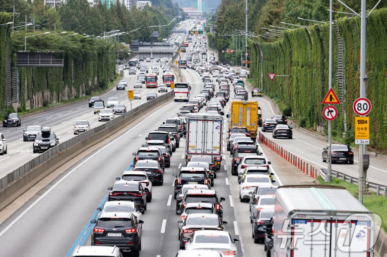 서울 서초구 잠원IC 부근에서 바라본 경부고속도로에 정체가 빚어지고 있다.(자료사진) 2025.8.17/뉴스1 ⓒ News1 이승배 기자 |