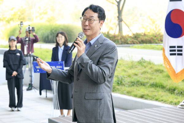 정명근 화성특례시장이 동탄호수공원 주차타워 준공식에서 인사말을 하고 있다/[사진=화성시]외관은 공원과 조화를 이루는 조형미를 살렸으며 건물 하부의 대형 아치 공간은 단순한 구조물이 아닌 열린 광장으로 계획돼 공연, 버스킹, 휴식 등 다양한 활동이 가능한 복합문화공간으로 활용될 예정입니다.
