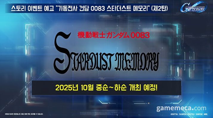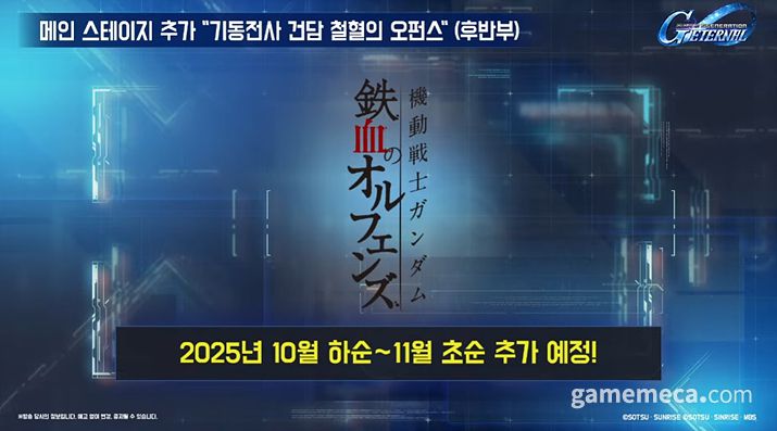 여기에 10월 중순에는 0083 스타더스트 메모리(제2탄)이 업데이트되고, 10월 하순부터 11월 초에는 철혈의 오펀스(후반부)가 개방된다. 0083 스타더스트 메모리(제2탄)에서는 건담 시작 3호기 스테이멘, 건담 시작 3호기가, 쳘혈의 오펀스(후반부)에는 건담 발바토스 루프스 렉스, 시덴 카이(류세이고) 등이 개발 가능 기체로 등장한다.