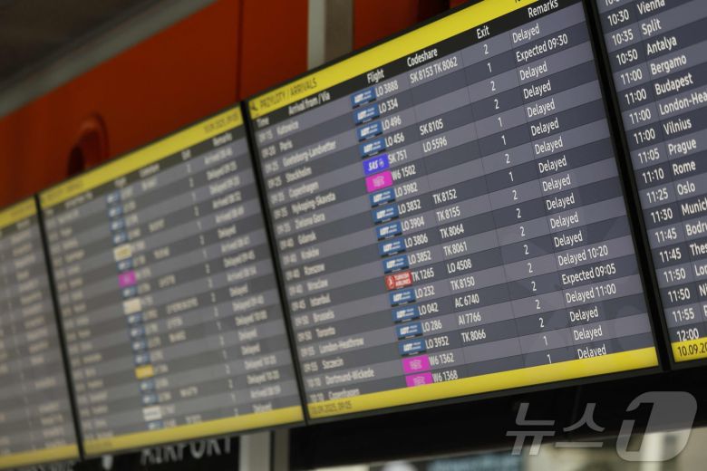 러시아 드론의 폴란드 영공 침범 직후 바르샤바 국제공항의 안내판에 대다수 항공편이 '지연'(Delayed) 표시돼 있다. 2025.09.10 ⓒ AFP=뉴스1 ⓒ News1 이지예 객원기자 |