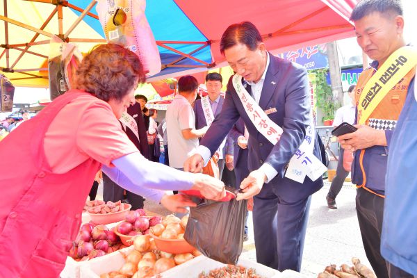 김한종 장성군수가 29일 황룡전통시장에서 추석맞이 장보기 행사에 참석했다 [사진=전라남도 장성군] |