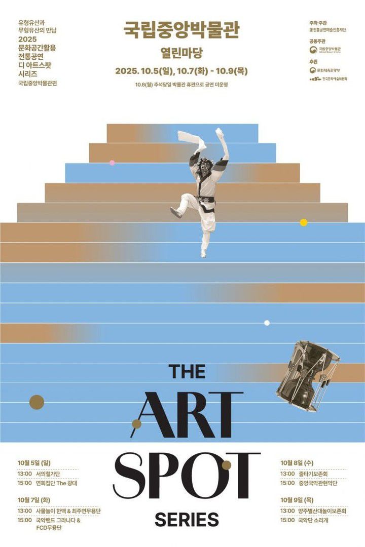 '디 아트스팟 시리즈'는 국립중앙박물관과 전통공연예술진흥재단이 함께 공동 진행하는 프로그램으로 문화공간을 활용해 국민의 문화 향유 기회를 확대한다는 취지로 시작됐다. '유형유산과 무형유산의 만남'이라는 주제로 전통 공연과 현대 창작 공연을 다채롭게 선보일 예정이다. 나흘간 이어지는 모든 공연은 사전 예약 없이 현장에서 무료 관람 가능하다.