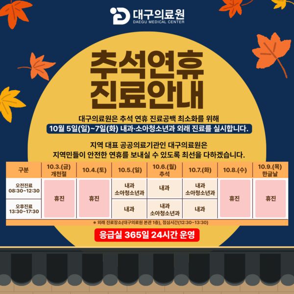 [박용 기자] [포인트경제] 대구의료원(의료원장 김시오)은 예년보다 긴 추석 연휴를 대비해 연휴 기간 응급실 운영 강화 및 내과·소아청소년과 외래 진료를 실시한다고 2일 밝혔다.