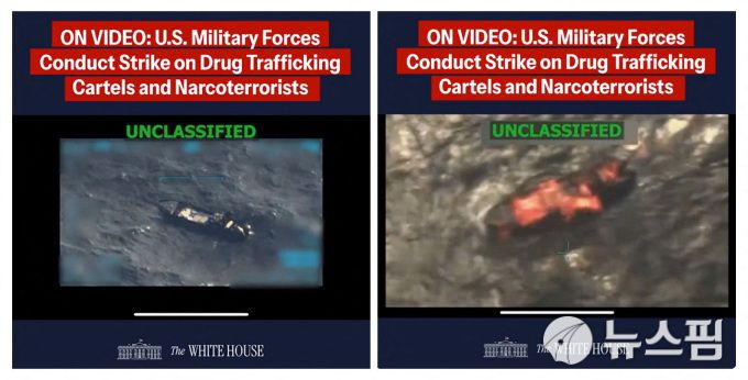2025년 9월 15일, 백악관 공식 X(구 트위터) 계정에 게시된 동영상. 도널드 트럼프 미국 대통령이 미국으로 향하던 베네수엘라 마약 카르텔 선박에 대한 미군의 공격이라고 밝힌 장면을 담고 있다. 최근 몇 주 사이 마약 밀수 혐의 보트에 대한 미국의 두 번째 군사 공격이기도 하다. [사진=로이터 뉴스핌] |