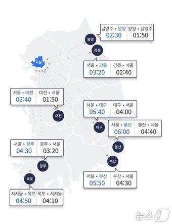 지방에서 서울까지는 △부산 4시간 30분 △울산 4시간 40분 △강릉 2시간 40분 △양양 1시간 50분(남양주 도착) △대전 1시간 50분 △광주 3시간 20분 △목포 4시간 10분(서서울 도착) △대구 4시간이 걸릴 것으로 예상된다.